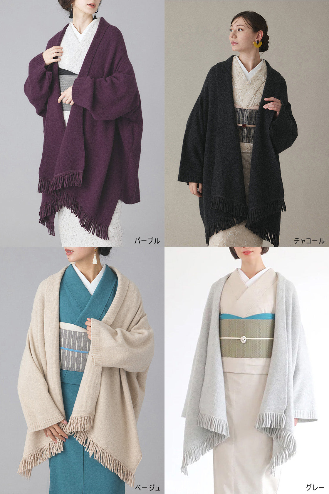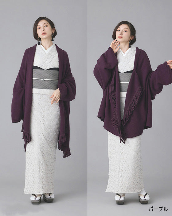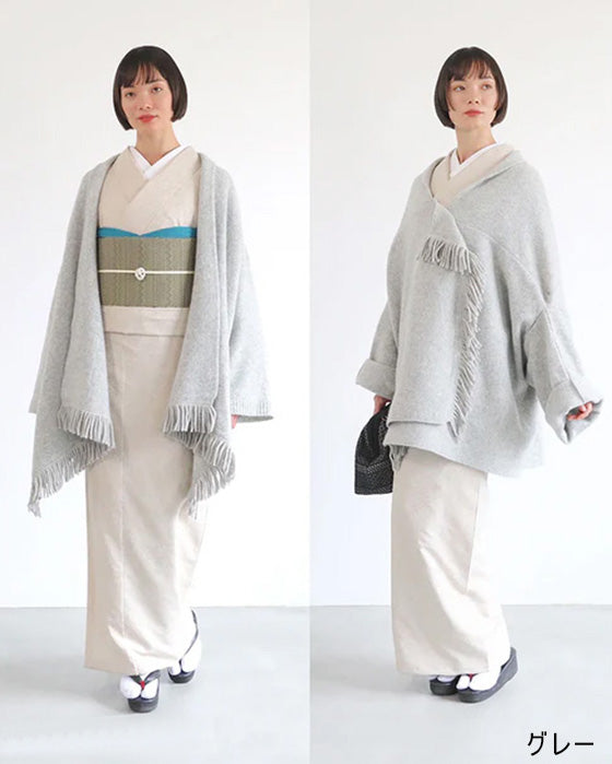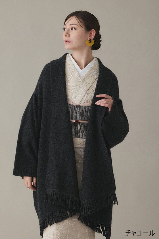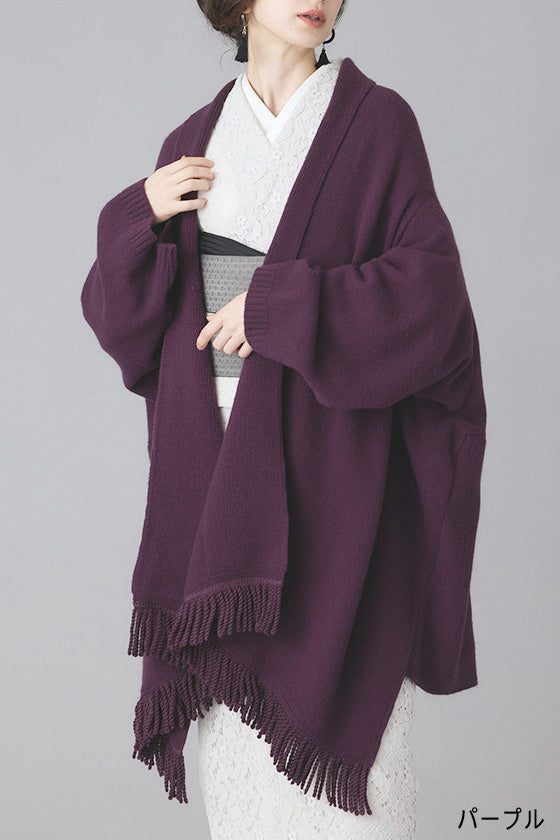 ショールを肩から羽織っているような見え感です。実際のショールと違い袖を通せるので肩からずり落ちずらく、動きやすく実用的です。フリンジは裾位置になります。